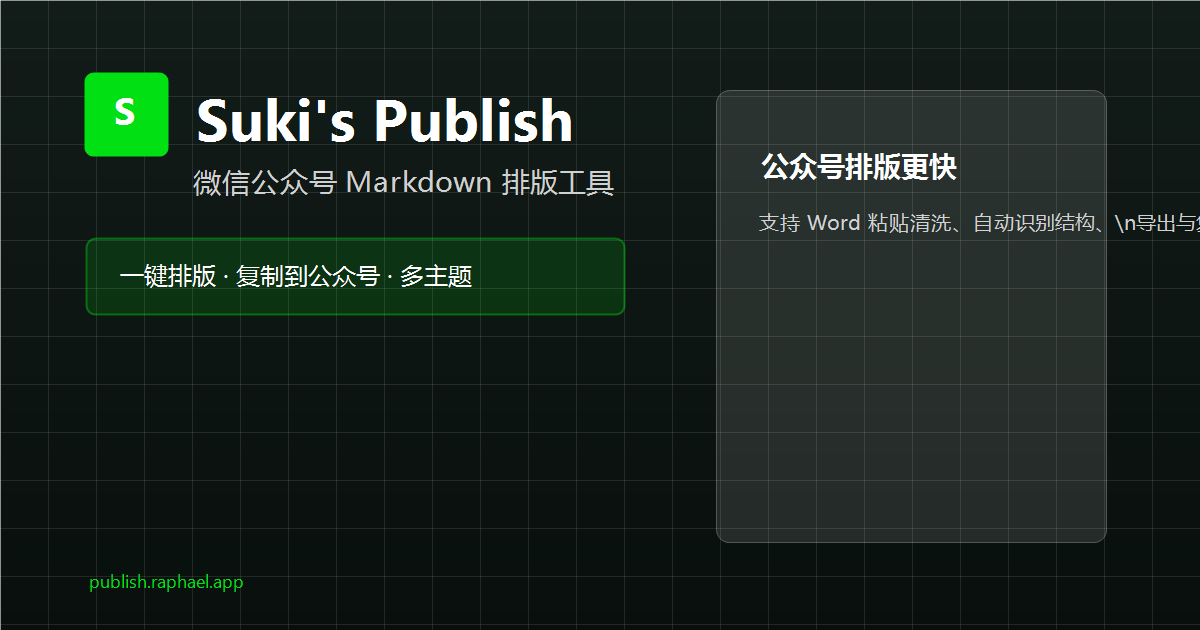 # Sukis Publish - 公众号排版大师 > 欢迎使用 Sukis Publish,一款专为**微信公众号**与**内容创作者**设计的现代 Markdown 排版引擎! ## 核心功能 ### 1. 魔法粘贴 - **跨平台粘贴**:直接从**飞书、Notion、Word**甚至任意网页复制富文本,粘贴瞬间自动转换为纯净 Markdown - **智能清洗**:自动剥离冗余样式和乱码,只保留段落、粗体、列表、代码块等核心结构 - **零学习成本**:不需要会写 Markdown,粘贴进来就能用 - **图片直贴**:支持直接粘贴截图或剪贴板图片(Ctrl/Cmd + V),自动插入 Markdown 图片 ### 2. 多图排版 支持朋友圈式的多列网格布局,比如下面自然形成的两图并排。通过 `wechatCompat` 引擎这些多图也能在微信中完美呈现:   ### 3. 30 套高定样式 告别同质化的白底模板,30 套精心打磨的视觉主题任你切换(下方仅展示部分代表风格): 1. **极简与经典**:Mac 纯净白、微信公众号原生、Medium 博客风 2. **深度阅读**:Claude 燕麦色、NYT 纽约时报、Retro 复古羊皮纸 3. **极客与商务**:Stripe 硅谷风、飞书效率蓝、Linear 暗夜模式、Bloomberg 终端机 > 试试在顶部切换不同的「排版风格」,每一套都有独特的配色、字体和引用样式。 ### 4. 一键复制到公众号 点击「**复制到公众号**」按钮,粘贴到公众号后台,格式完美保留: - **图片自动打包**:所有外链图片自动转 Base64,不会出现"此图片来自第三方"的报错 - **样式零丢失**:背景色、圆角、间距全部精准还原 - **表格不塌陷**:底层 DOM 重塑,列表和表格在微信中不会排版错乱 ### 5. 多端实时预览 右侧工具栏提供三种预览尺寸: - **手机视图** (480px):模拟微信阅读的真实宽度 - **平板视图** (768px):适合横屏阅读效果预览 - **桌面视图** (PC):完整宽屏预览 ### 6. 导出功能 除了复制到公众号,还支持: - **导出 PDF**:一键生成高质量 PDF 文件,适合存档和分享 - **导出 HTML**:获取完整的带样式 HTML,可用于邮件或网页发布 ## 代码高亮 内置 MacOS 风格的代码高亮控制台,支持多种编程语言: ```javascript // Sukis Publish 排版引擎核心流程 const raphael = { // 1. smart paste: 自动清洗富文本 paste: (richText) => cleanToMarkdown(richText), // 2. render: Markdown → 带样式 HTML render: (md) => applyTheme(md, selectedTheme), // 3. export: 图片打包 + 微信兼容处理 export: async (html) => { const compatible = await makeWeChatCompatible(html); return bundleImagesAsBase64(compatible); } }; ``` ## 引用样式 > 每套主题都有独特的引用样式——不同的背景色、字体颜色和左侧边栏。切换主题时,留意引用块的变化。 ## 表格支持 | 功能 | 说明 | |------|------| | 魔法粘贴 | 从飞书/Notion/Word 粘贴,自动转 Markdown | | 30 套主题 | 经典 / 潮流 / 更多风格,全场景主题随时切换 | | 图片打包 | 外链图片自动 Base64,微信零报错 | | 图片直贴 | 支持截图/图片直接粘贴,自动转为 Markdown 图片 | | 多图排版 | 2-3 列网格布局,微信中不塌陷 | | 代码高亮 | MacOS 风格指示灯 + 多语言语法高亮 | | 多端预览 | 手机 / 平板 / 桌面三种视图实时切换 | | 导出 | 支持 PDF 和 HTML 导出 | --- **提示**: - 在顶部切换「排版风格」,体验不同主题的视觉效果 - 从飞书或 Notion 复制一段内容粘贴到左侧,体验魔法粘贴 - 点击设备图标切换手机/平板/桌面预览 - 清空以上内容,开始你的创作